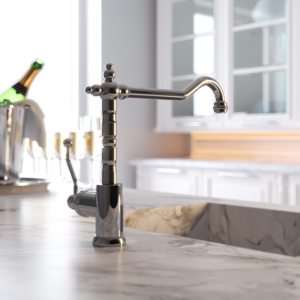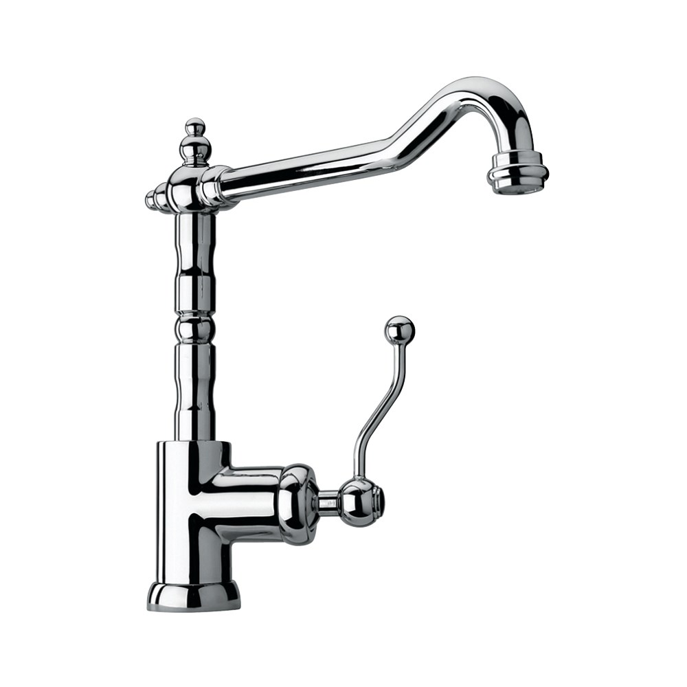Однорычажный высокий смеситель в винтажном стиле украсит кухню, его поворотный длинный излив позволят менять направление потока воды. Изысканная форма позволит сделать смеситель самостоятельным арт-объектом на кухне. Антикварные изгибы DUOMO будут органично смотреться в стилях классика, винтаж или по-новому раскроют интерьер в стиле фьюжн.