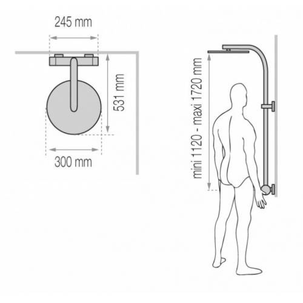 Эксклюзивный, экстра-плоский верхний тропический душ D400 mm. -Ручной Душ: -Душ D 95 mm ABS с 3-х позиционной массажной лейкой система Декальцинации (легкая очистка известковых отложений) -Экономичный расход воды -Хромированные корпус и резьба -Гибкий силиконовый шланг 1.75 м. Штанга: -Душевая штанга из нержавеющей стали с закрепляющимися двухсторонними мыльницами -Регулировка по высоте min 1120 max 1720 mm. -Пристенный вариант установки. -Термостатический смеситель NF.Блокируемая температура +38 C с функцией Анти-Ожог
