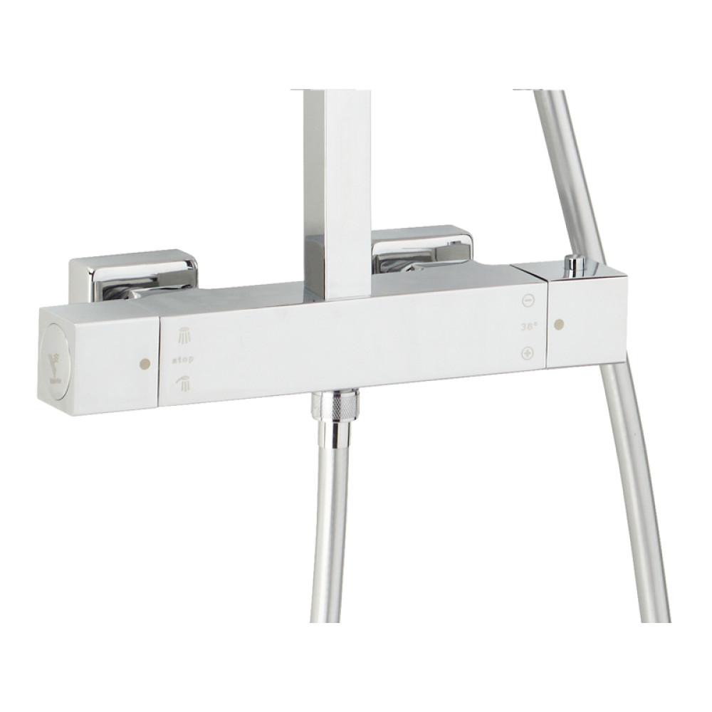 Ультра тонкий дизайн. -Эксклюзивный, экстра-плоский верхний тропический душ D 200х300 mm. Ручной Душ: -Лейка ширина 20 мм высота 55 мм система Декальцинации (легкая очистка известковых отложений) -Экономичный расход воды -Хромированный корпус -Гибкий силиконовый шланг 1.75 м. Штанга: -Душевая штанга из нержавеющей стали с закрепляющимися двухсторонними мыльницами (дополнительная опция) -Регулировка по высоте min 1200, max 2000 mm. -Пристенный вариант установки. - Термостатический смеситель
