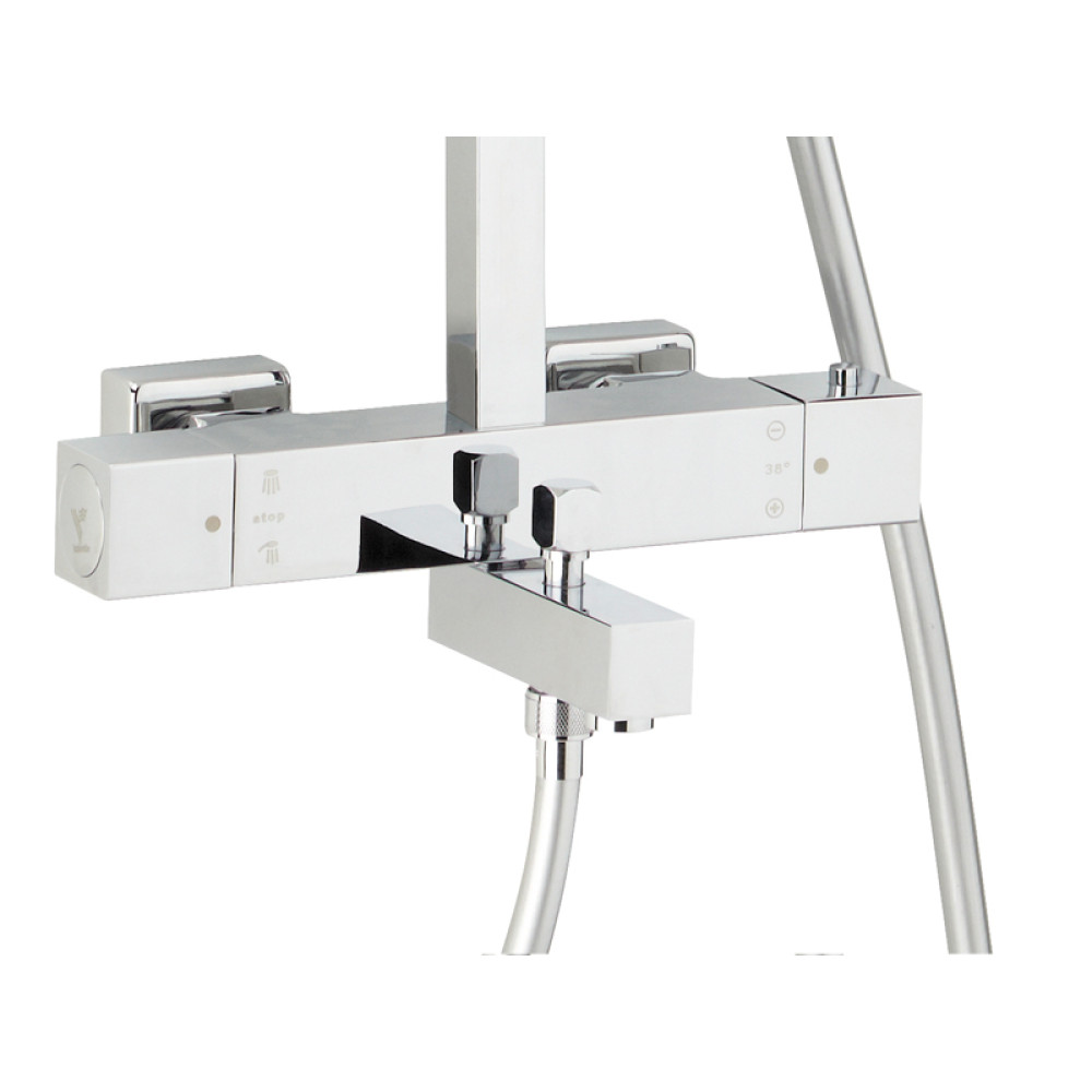 Ультра тонкий дизайн. -Эксклюзивный, экстра-плоский верхний тропический душ D 200х300 mm. Ручной Душ: -Лейка ширина 20 мм высота 55 мм система Декальцинации (легкая очистка известковых отложений) -Экономичный расход воды -Хромированный корпус -Гибкий силиконовый шланг 1.75 м. Штанга: -Душевая штанга из нержавеющей стали с закрепляющимися двухсторонними мыльницами (дополнительная опция) -Регулировка по высоте min 1200, max 2000 mm. -Пристенный вариант установки. -Термостатический смеситель NF.Блокируемая температура +38 C с функцией Анти-Ожог -Смеситель для наполнения воды в ванну