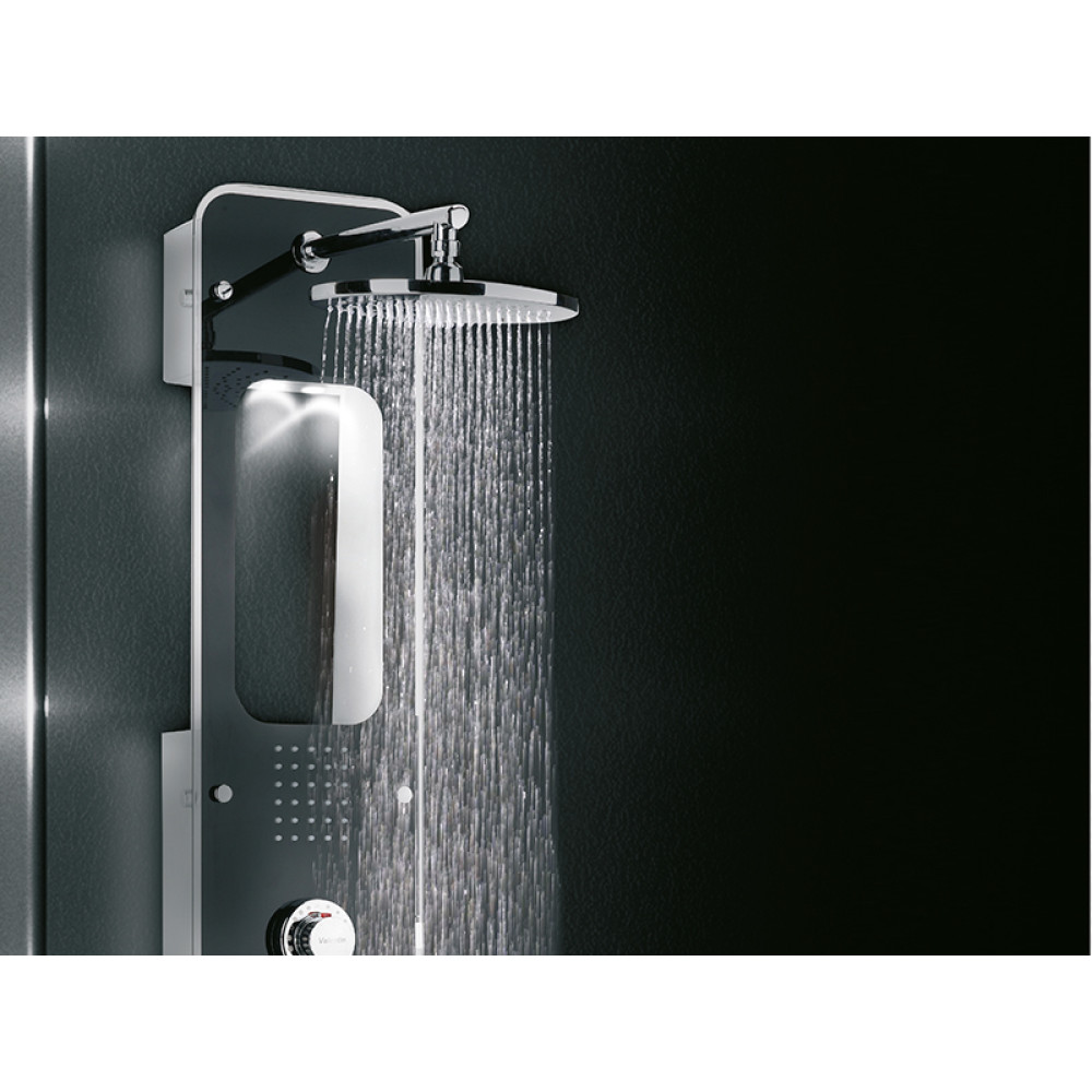 Верхний тропический душ D 215 mm. (Латунь) -Ручной душ. -Гибкий шланг 1.75 м Панель: -2 гидромассажных сектора по 30 сопел каждый. -Одновременно либо по очереди воздействует на верхнюю и нижнюю части тела. -Включает систему автоматической самоочистки Quick Clean -Сопла на верхнем душе, форсунках, на душевой лейке, выполнены из силикона с антиизвестковым компонентом -Панель выполнена из специального,закалённого небьющегося стекла NB, на анодированном алюминиевом профиле. -Имеет 2 полочки защищённые от попадания воды,оснащённые светодиодной подсветкой. -Термостатический смеситель NF.Блокируемая температура +38 C с функцией Анти-Ожог -Пристенный вариант установки.