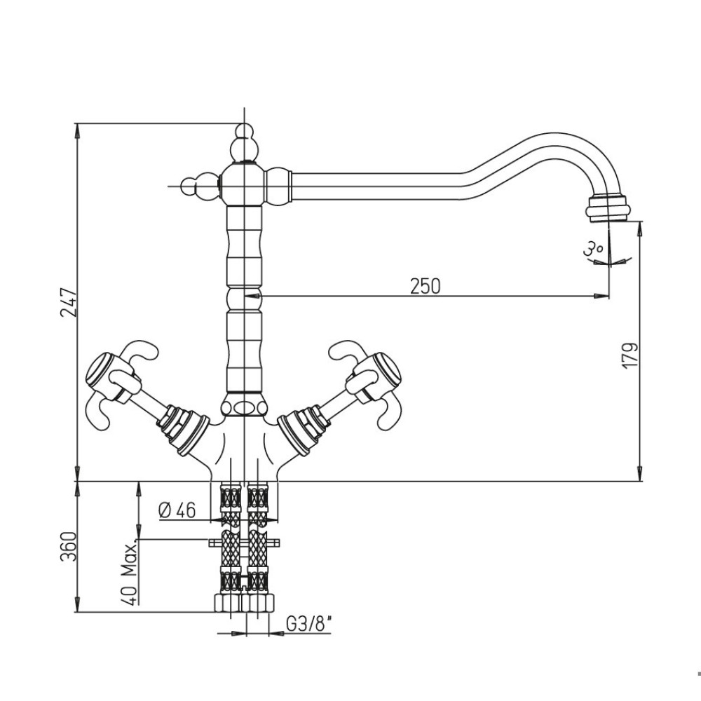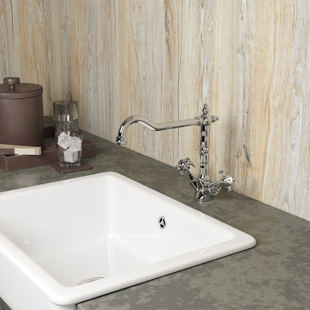 Высокий корпус и поворотный излив делают двухвентильный смеситель незаменимым для кухни, позволяя наполнить кастрюлю или вазу водой, помыть посуду. Изгиб длинного прямого излива делает функциональность небанальной и привлекательной. Смеситель сможет стать украшением дизайна в стиле нео-классицизм, модерн или расставить акценты в стиле фьюжн.
