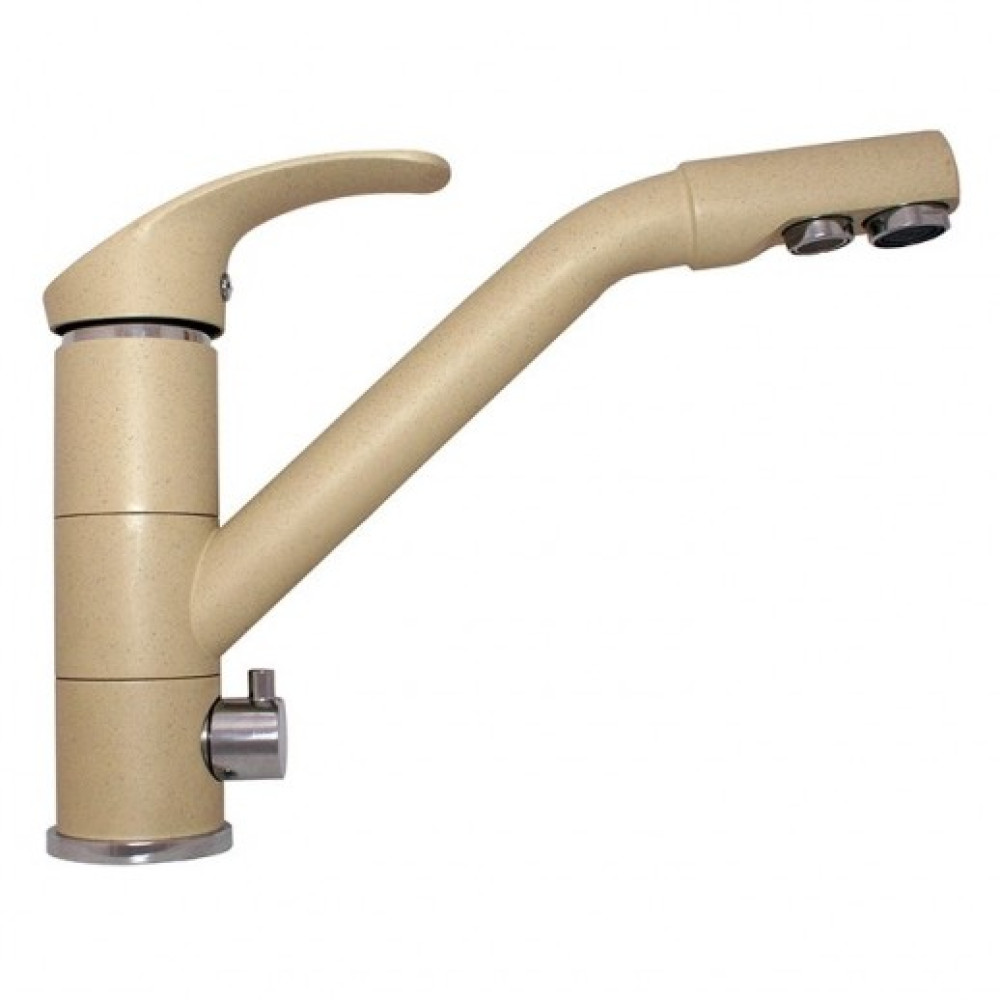 - Корпус из латуни с покрытием бежевый гранит подходит для популярного цвета моек, удобен в уходе.