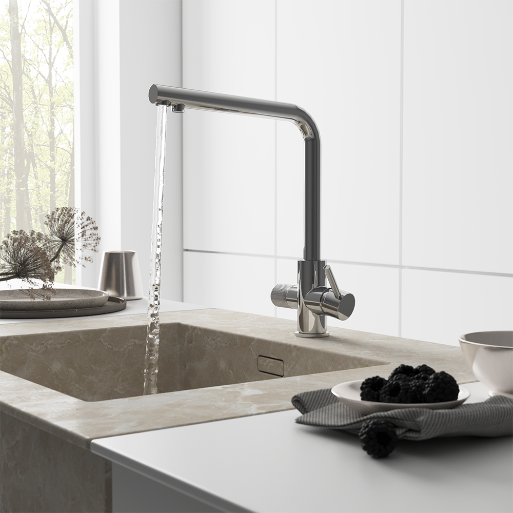 - Помимо стандартного рычага для управления температурой воды и открытия / закрытия, имеется рычаг для подачи фильтрованной воды.