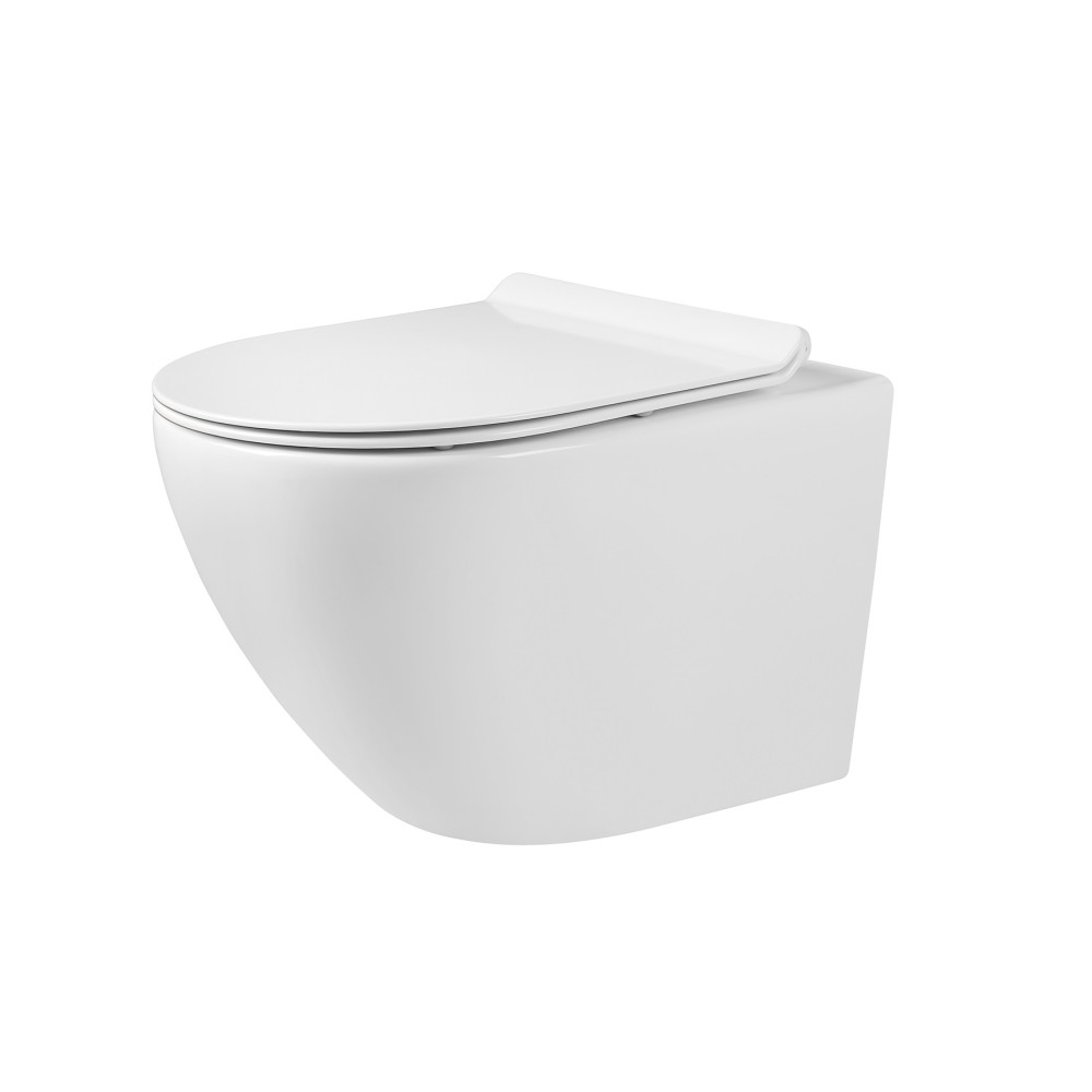 Подвесной безободковый унитаз с ультратонким сиденьем для современного интерьера ванной комнаты.