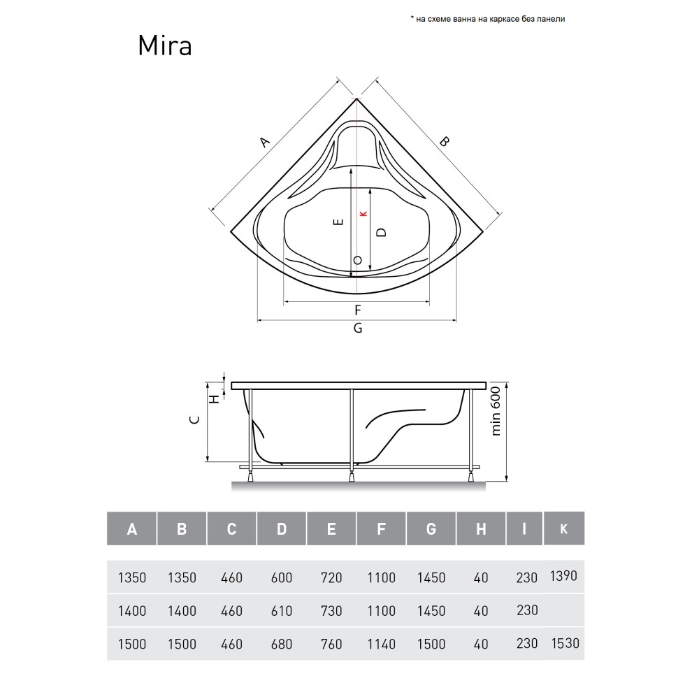 | Вес, кг.27 | Высота ванны на каркасе60 | ГидромассажВозможна установка гидросистем |