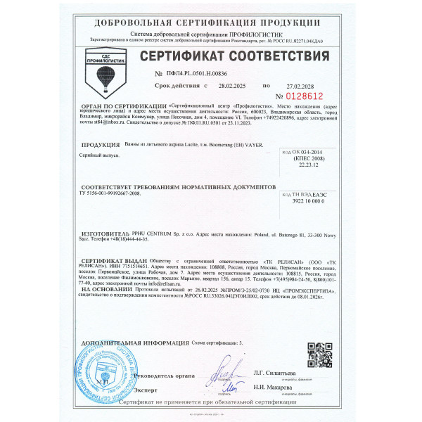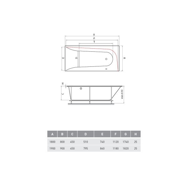 Технические характеристики Ванна акриловая Vayer Boomerang (EH) 180x80 R