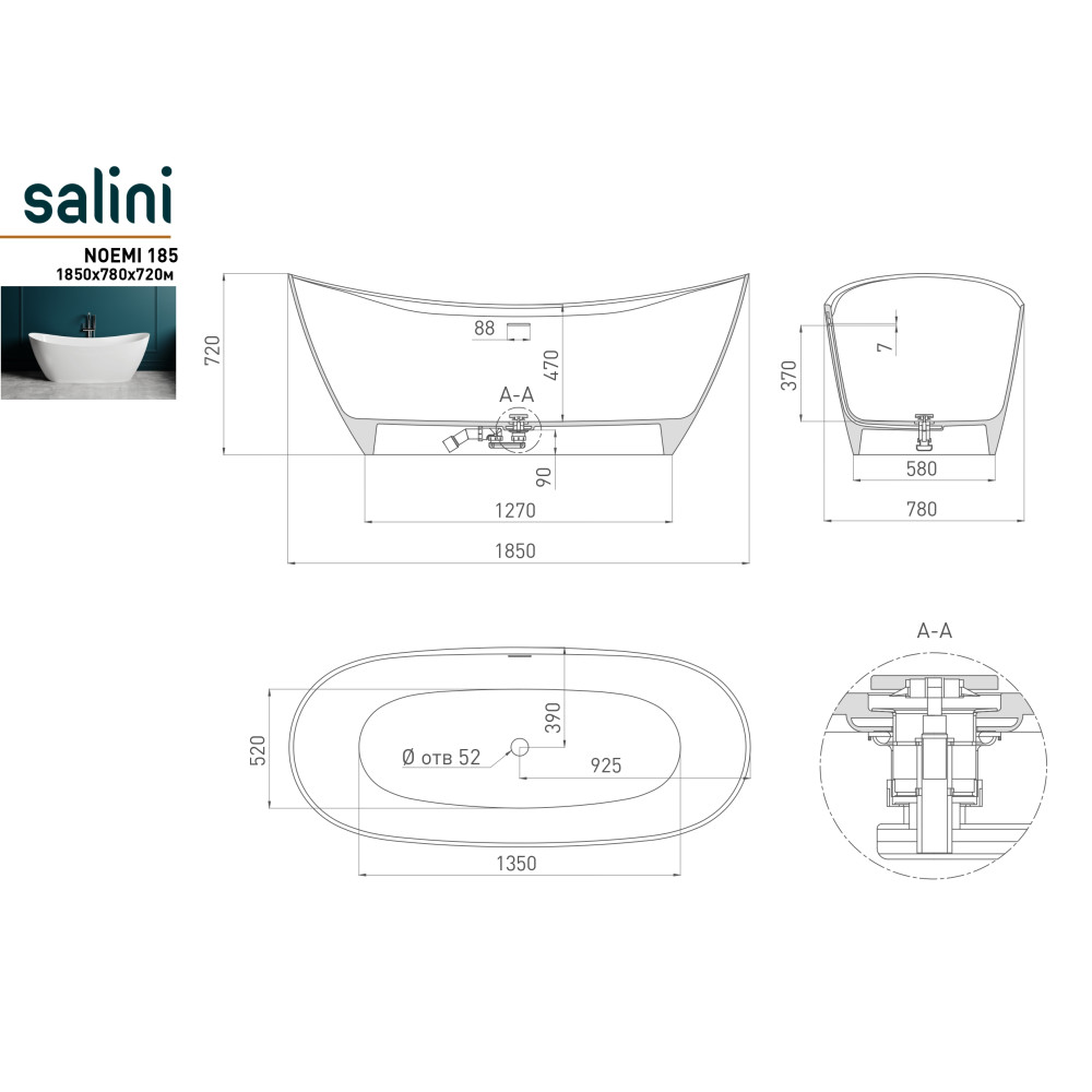 Большая изысканная отдельностоящая ставшая культовой ванна, одна из самых крупных по глубине и внутренней вместимости. В NOEMI можно принимать ванну вдвоём — размер чаши позволяет разместиться в ней с максимальным комфортом. Архитектурное бюро Salini специально разработало дизайн чаши таким образом, чтобы на бортики ванны можно было удобно положить руки. Невероятно удобная внутри — она мгновенно настраивает на расслабление и отдых. В ванной Noemi прямое длинное широкое дно и высокие бортики, поэтому она подойдёт тем, у кого рост или комплекция больше среднего.