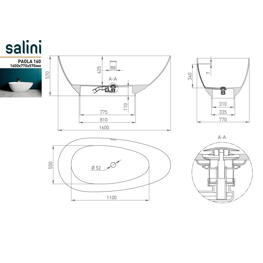 Технические характеристики Ванна PAOLA 160 S-Stone Матовое