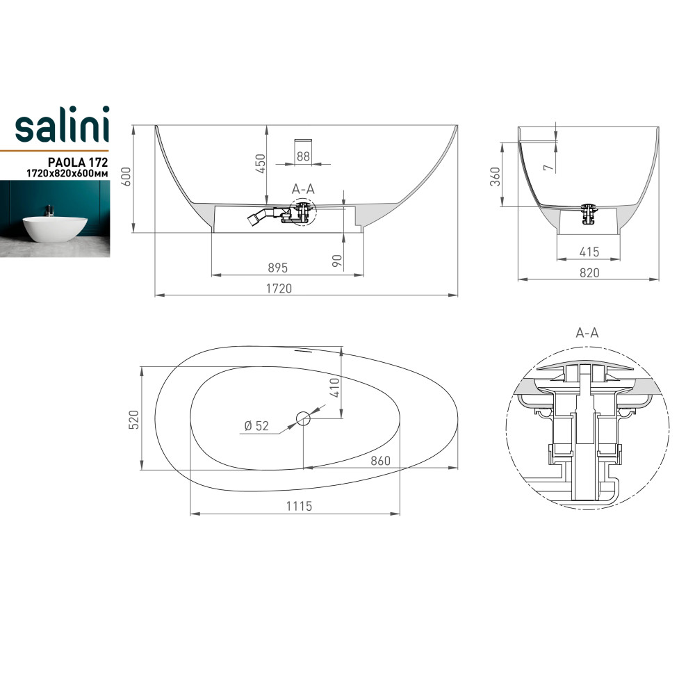 Технические характеристики Ванна PAOLA 172 S-Sense Глянцевое